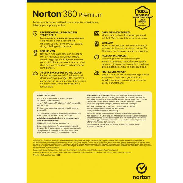 NORTON 360 PREMIUM 75GB IT 1 USER 10 DEVICE 1Y VECCHIO CODICE 21397805 [21429125]
