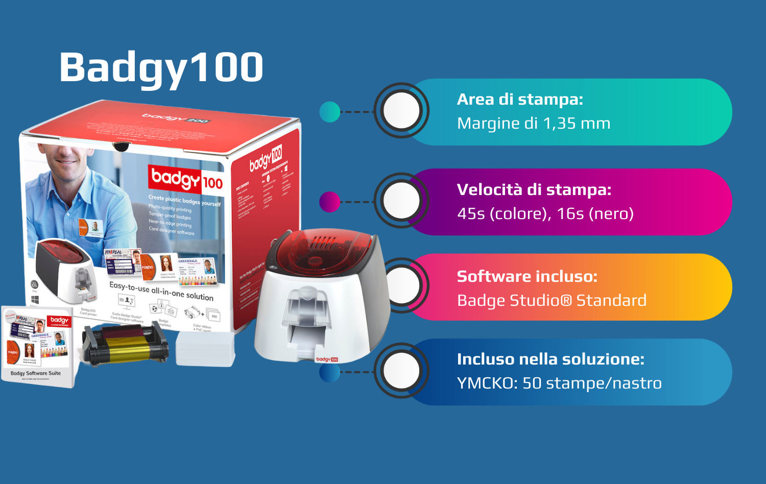 ![Evolis Badgy 100 stampante per schede plastificate Sublimazione/Trasferimento termico Colore 260 x 300 DPI [B12U0000RS] - ITPartners](http://www.it-partners.it/cdn/shop/files/6shooting_badgy100_web_05201401_R.png?v=1743095445&width=813)
