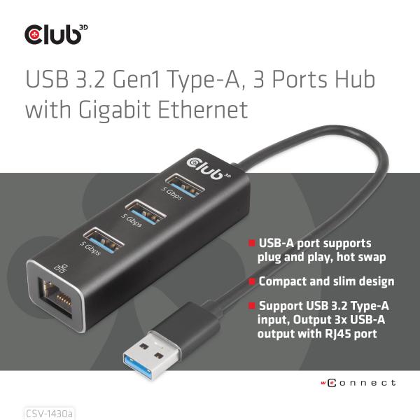 CLUB3D HUB USB 3.2 GEN1 TYPE A 3-Ports Gigabit Ethernet [CSV-1430A]